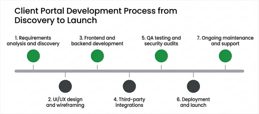 From discovery and UX design to development, integration, and ongoing support, we follow a structured, agile-driven process focused on measurable outcomes. Contact us to discuss your requirements, explore the right portal approach, and get a clear roadmap to build a secure, scalable client portal for your business.