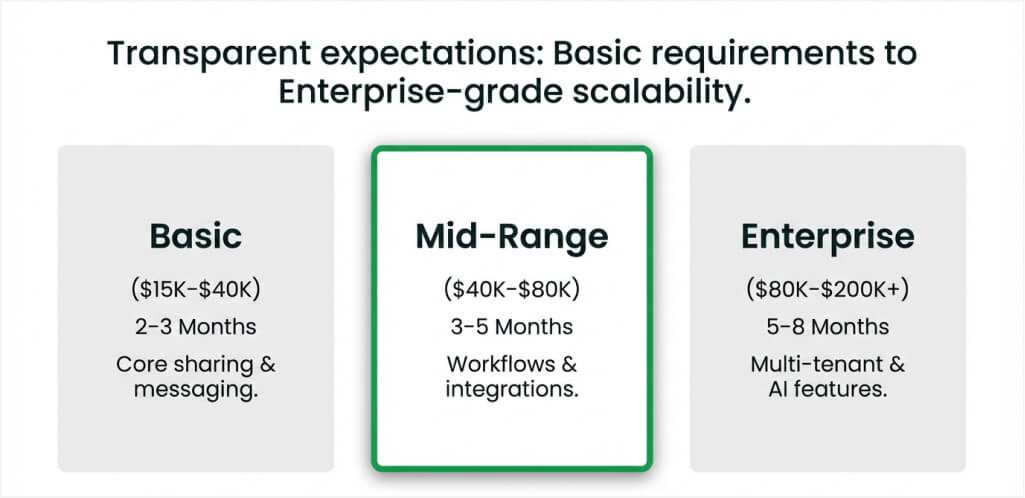 | Basic | Login, document sharing, messaging, basic dashboard | 2–3 months | $15,000–$40,000 |