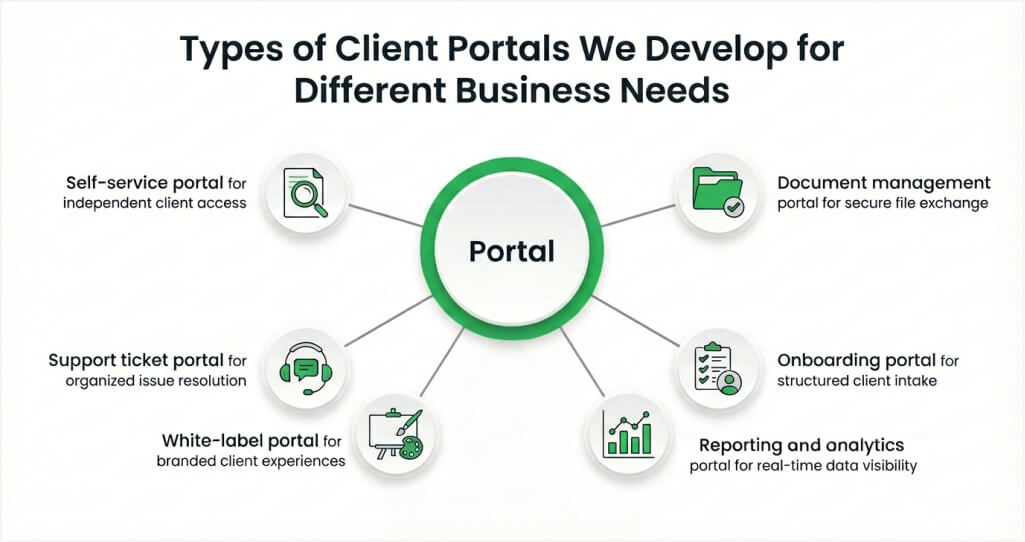 These benefits make client portal development one of the highest-ROI investments for service-based businesses. With that in mind, let’s look at the different types of client portals we develop at Space-O Technologies.