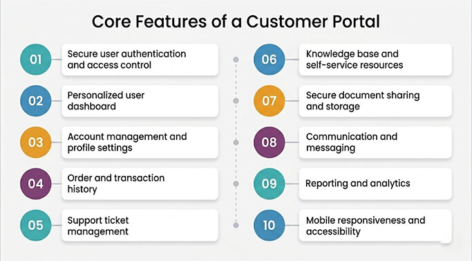 Successful customer portals combine foundational capabilities with specialized features for specific industries. Understanding these components helps prioritize development investments. Let us explore the essential features that deliver value to both customers and businesses.