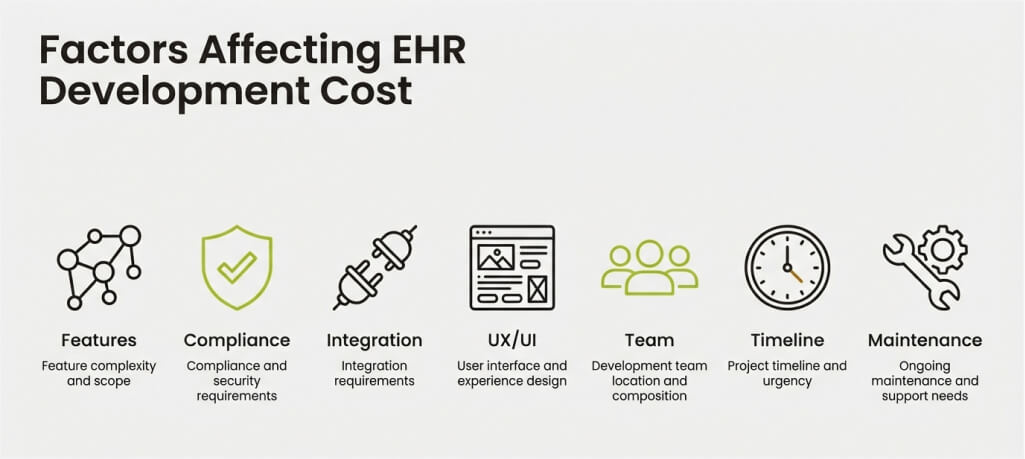 Multiple variables determine your final EHR software development pricing. Understanding these factors helps you anticipate expenses and make informed decisions about project scope.