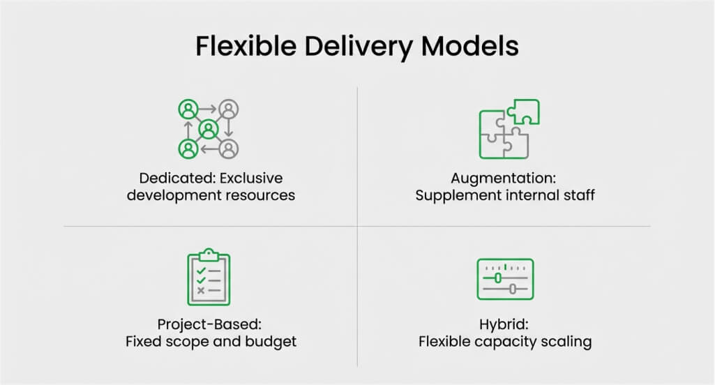 Common models include dedicated teams, staff augmentation, and project-based outsourcing. Dedicated teams provide exclusive resources working solely on your projects. Staff augmentation adds individual developers to your existing teams. Project-based engagements deliver a defined scope, fixed pricing, and timelines.