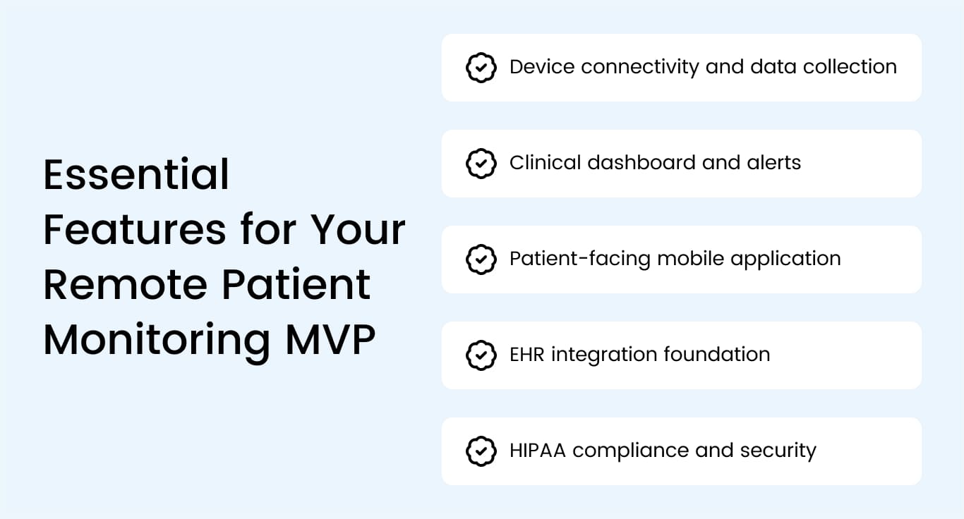 Essential features include device connectivity for your target condition, a clinical monitoring dashboard with threshold-based alerts, basic patient engagement tools, HIPAA-compliant data storage, and role-based access controls. Defer AI-powered analytics, comprehensive EHR integration, and multi-condition monitoring to post-MVP phases.